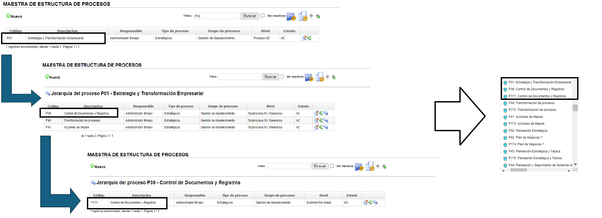 Para realizar el ordenamiento de sus procesos tan solo ejecute la opción de ordenamiento masivo en la maestra de procesos y listo el sistema organizara de acuerdo a la jerarquía que haya parametrizado.