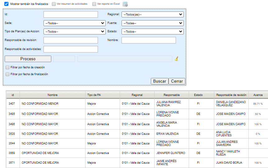 Síntoma: Cuando se quita filtro de finalizados "Filtros de Plan(es) de Accion" el sistema sigue presentando los planes con estado Finalizados
